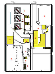◆د غرفة أداة التتابع باب غرفة الأدوات مغلق ، وغرفة الأدوات في منظر أمامي. | ◆جهاز تخفيف الضغط عندما يكون قاطع الدائرة أو شريط التوصيل الرئيسي ، تحتوي غرفة الكبل على قوس خطأ داخلي ، مع ظهور الكهرباء ، يرتفع ضغط الهواء داخل مفتاح التبديل ، وبعد الوصول إلى ضغط معين ، سيتم فتح اللوحة المعدنية لإطلاق الضغط في الجهاز العلوي تلقائيًا لتحرير الضغط وتفريغ الغاز لضمان سلامة المشغل والمفاتيح الكهربائية. |