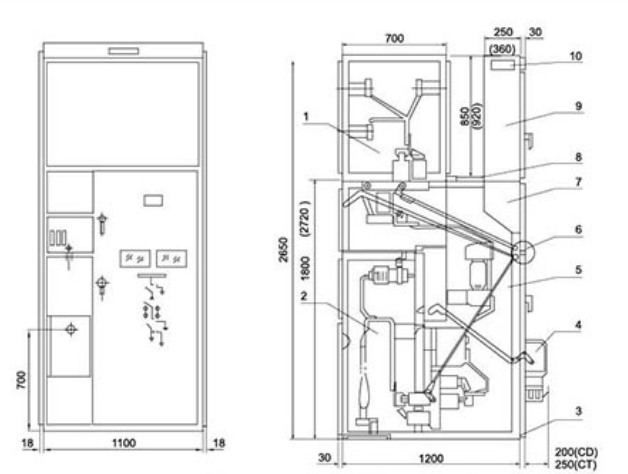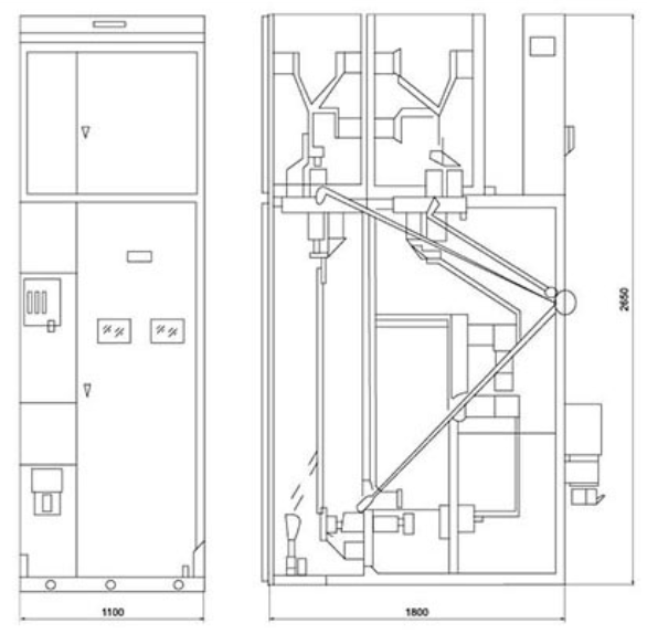 الخزانة عبارة عن هيكل مدرع معدني مغلق ، الهيكل العظمي للخزانة ملحوم بزاوية فولاذية ، وتنقسم الخزانة إلى غرفة قاطع الدائرة ، وغرفة بسبار ، وغرفة كابل ، وغرفة ترحيل ، ويمكن ملاحظة تشغيل المكونات الرئيسية في الخزانة من خلال نافذة المراقبة والإضاءة على الواجهة. من أجل تحسين الأداء الفني للمفاتيح الكهربائية ، تمت إعادة تصميم المكونات الرئيسية (مثل قواطع الدائرة الكهربائية ، ومفاتيح قطع التوصيل الدوارة ، وما إلى ذلك).