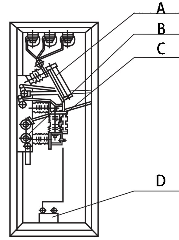 ![]() | الشكل 3 أ: الصمامات (بوابة سكين العزل) ب: آلية التحكم في الرصاص ج: مفتاح تحميل د: محول التيار |