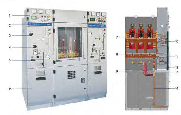 11. آلية ثلاث محطات 12. آلية متشابكة خمسة واقية 13. خط مدخل ومخرج من خلال غلاف الجدار 14. قضبان تأريض